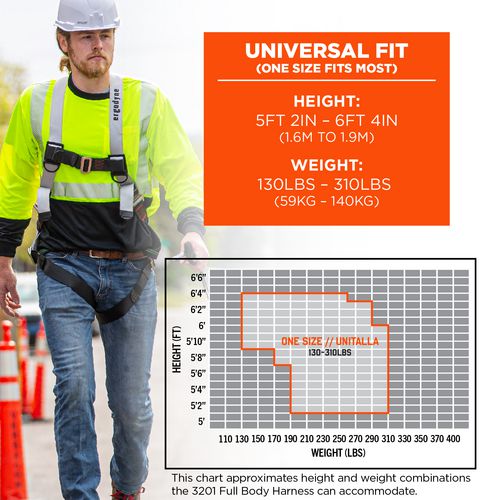 Squids 3201 Fall Restraint Harness and Lanyard Kit is designed specifically for use with mobile elevating work platforms (MEWPs), such as boom, scissor lifts and other applications where fall restraint is required. While fall arrest systems protect a user when a fall occurs, a fall restraint system prevents you from reaching a fall hazard by connecting the user's harness to a reliable, stable anchor system. This fall restraint kit includes one harness and one 4 ft travel restraint lanyard. The full body harness is built to last with heavy-duty polyester webbing and five steel buckles around the chest, waist and legs for easy adjustment. A high-quality forged steel dorsal D-ring is located on the backside for secure travel restraint lanyard attachment. The fixed-length, non-elastic lanyard connects the worker's harness to the equipment platform's available anchor points in order to restrain travel and prevent falls.