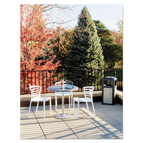 Attractive container helps manage waste and litter, indoors or out. Strong steel frame and decorative, galvanized steel panels provide the right in any first impression area. Four-sided opening makes it easy for pedestrians to drop their waste in passing. No assembly required and includes rigid plastic liner.