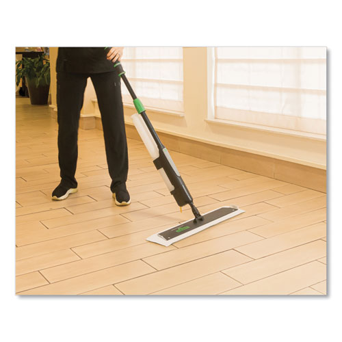 Single-use disposable pads prevent cross-contamination risks. Synthetic, spunlace material cleans floors evenly while allowing for consistent dwell times when using disinfectants. Excella Single-Use Spunlace Mop Pads are compatible with any hook-and-loop-style mopping system.
