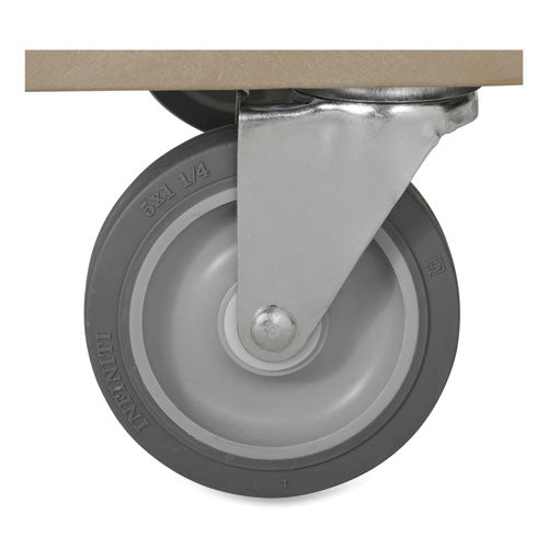 The Rubbermaid Commercial Heavy-Duty Utility Cart, 2 Shelf, Medium, is constructed of sturdy structural foam that will not dent, chip, or peel. 2 shelves support up to 500 lbs. of materials throughout the facility. Crafted with ergonomic handles for perfect hand placement, this rolling cart has rounded corners to protect walls and furniture and 4" non-marking swivel casters for lightweight maneuverability. With molded handle compartments for additional storage, molded fittings for rolled supplies and easy-access top and bottom shelves, this is a versatile and indispensable utility cart for any facility.