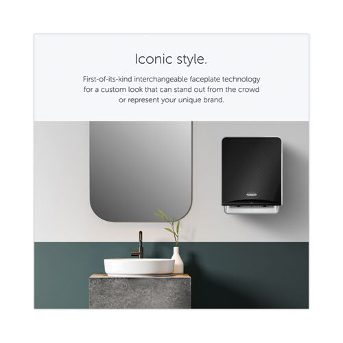The Kimberly-Clark Professional ICON™ automatic paper towel dispensing system features first-of-a-kind versatility and effortlessly enhances the look of the restroom with one of an exclusive line of six designer faceplates. Inspired by human-centered design, the ICON™ dispenser features intuitive control panel, front-load battery bay and dampened hinge technology. Using direct-drive technology the ICON™ dispenser has a patented dual sensor technology that delivers worry-free, touchless 99.99% jam-free dispensing and is compatible with your choice of Kleenex or Scott roll towels.