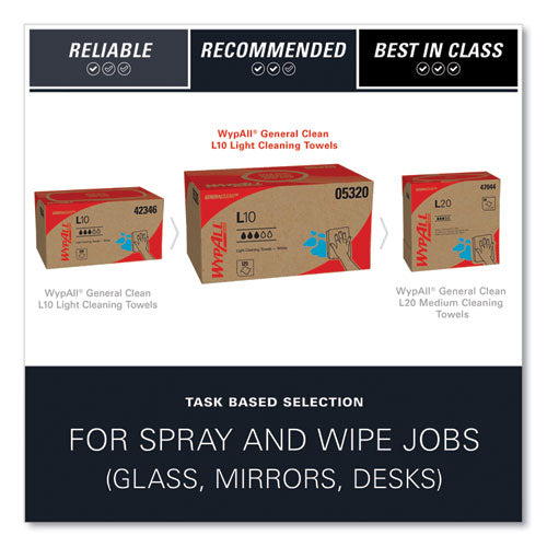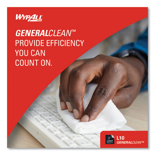 When you need a light-duty wiper to deliver results at an economical price, the WypAll L10 Utility Wipers are a great choice. They are soft, strong and absorbent, so they're a favorite replacement for cleaning towels for spray-and-wipe jobs, glass surface cleaning, absorbing small liquid spills, detail and final assembly wiping. You'll find these disposable wipers in hospitality housekeeping, retail cleaning and general light-duty cleaning. They're even gentle enough to use as hand wipes. The one-at-a-time dispensing can help you reduce waste and save money. The wipers are a terrific, reliable replacement for paper towels and can add efficiency to your business.