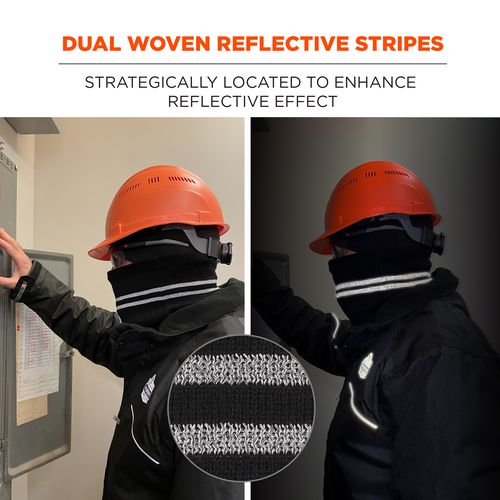 The N-Ferno 6961 Winter Neck Gaiter with reflective accents provides warm, no-bulk protection from demanding winter conditions while also enhancing visibility in low-light environments. The 100% stretchable acrylic shell with a soft liner makes for a snug, cozy fit that keeps cold out. Low-profile for wear alone or under hard hats. Unique to this neck warmer are two 360° reflective stripes to keep wearers safe and seen. Strategically placed close to one another, the stripes enhance reflectivity at all angles and create a larger overglow effect when they come into contact with light. They are sewn directly into the gaiter to reduce tears and rips when being stretched or worn. A soft interior makes for a comfortable, cozy fit. This versatile neck warmer can be worn around the neck or pulled over the mouth, nose and ears. One size fits most, this neck gaiter is ideal for those working in low-light environments or at night in construction, transportation or weekend activities.