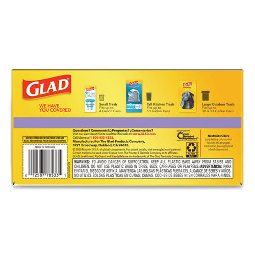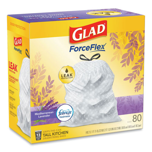 Fight nasty kitchen odors with Glad® trash bags. Glad® Tall Kitchen Drawstring Trash Bags are designed with ForceFlex technology to give extra flex as it expands around sharp edges and heavy loads, so you can pack it in while resisting tears, rips and punctures. Keeps your kitchen smelling pleasantly fresh with long lasting odor control. Let the stretchable strength of Glad® handle all the messes our busy daily life can throw at it and then some. With double-sided seals and a reinforced bottom, these bags are designed with RipGuard® and LeakGuard® technology to prevent seepage of liquids and keep trash contained. The durable Grips-The-Can Drawstring ensures a tight grip on the trash can to keep it in place. Take the trash to the curb with no fear of leaks and tears, and no frustration. Keep your kitchen smelling clean with the stretchable strength of Glad®. Ideal for use in offices, schools, daycare centers, restaurants, hotels and other commercial facilities.