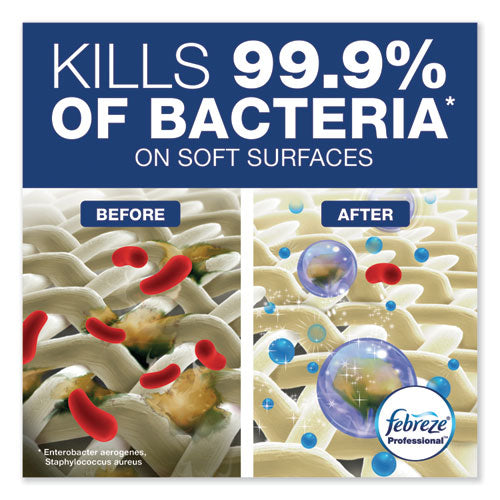 Soft surfaces that can’t be washed, such as mattresses and upholstered furniture, are harbors for harmful bacteria, mold and mildew. Febreze Professional Sanitizing Fabric Refresher gives you the same freshening power of Febreze plus the soft surface sanitization your environment needs. Proprietary technology goes to the source of odors and fights them. A light, fresh scent is left behind to leave the treated area smelling fresh and clean. Safe for virtually all fabrics. Spray soft surface until fully wet and the soft surface must remain wet for five minutes.