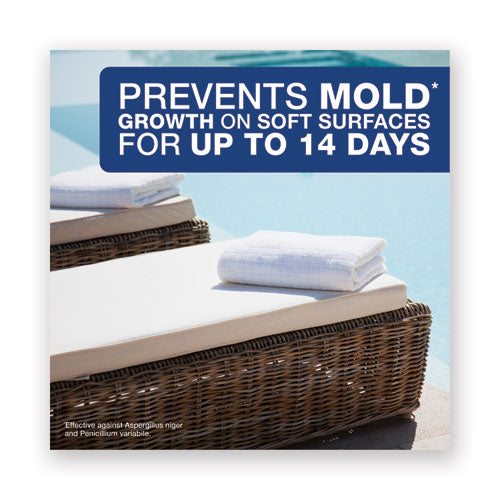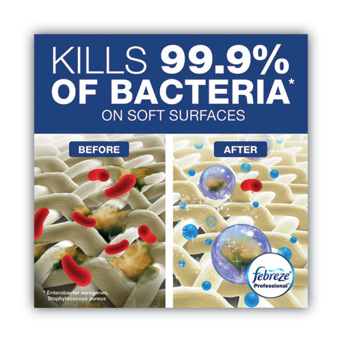 Soft surfaces that can’t be washed, such as mattresses and upholstered furniture, are harbors for harmful bacteria, mold and mildew. Febreze Professional Sanitizing Fabric Refresher gives you the same freshening power of Febreze plus the soft surface sanitization your environment needs. Proprietary technology goes to the source of odors and fights them. A light, fresh scent is left behind to leave the treated area smelling fresh and clean. Safe for virtually all fabrics. Spray soft surface until fully wet and the soft surface must remain wet for five minutes.