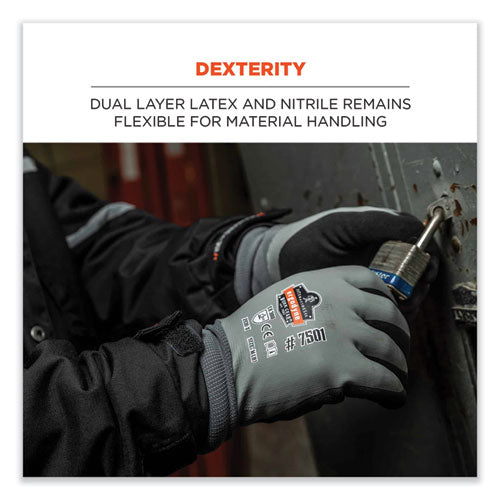 The ProFlex 7501 Coated Winter Work Gloves are dual layer for warm, waterproof protection in cold temperatures. Wet hands are cold hands. These coated gloves feature a full waterproof latex dip that protects you from the elements by keeping water and cold air out, with a second layer of sandy nitrile on the palms for abrasion-resistance and enhanced grip without compromised dexterity. A polyester liner with soft brushed acrylic fleece provides two levels of thermal protection. A double-lined interior, 15 g polyester topped with 10 g of brushed acrylic fleece, keep hands toasty and comfortable without bulk. These waterproof work gloves meet the EN388 standard for cut resistance. They are ideal for work in cold wet environments, including material handling and construction.