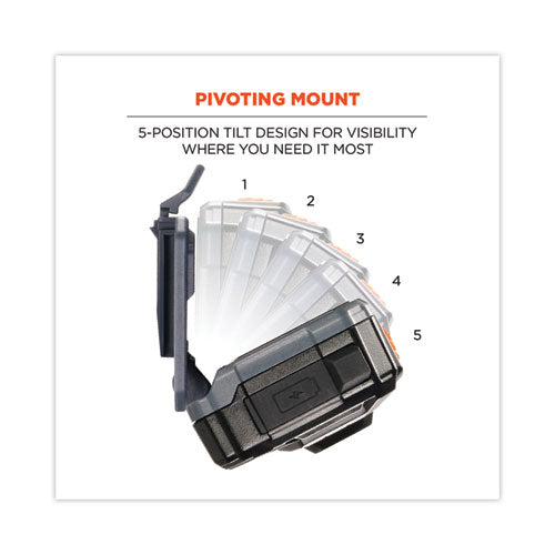 This rechargeable hard hat light easily attaches directly to any Skullerz® Hard Hat or Safety Helmet light mount. It simply slides and clips into the front or rear built-in mounts without the need for clunky straps or clamps. This portable headlamp features a built-in magnet on the back for securely attaching the light to metal on the worksite or for storing when not attached to a hard hat or helmet. Simply detach from the built-in mounting bracket to use as a flashlight/work light or to charge. This rechargeable hard hat light features a slim profile and a five-position tilt head design for visibility where you need it most. A one-button switch supports three working modes: boost (all-on), spotlight and floodlight. Boost (300 lumens for 4 hours) is for maximum light, spotlight (215 lumens for 9 hours) is for tight-beam long distance visibility and floodlight.