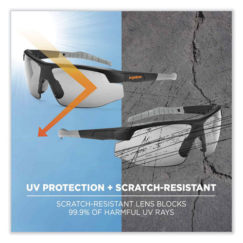 The Skullerz® Skoll Safety Glasses are named after the Norse Wolf God of Sun and Moon. These protective work safety sunglasses feature tough scratch-resistant lenses filter 99.9 percent of harmful UVA, UVB and UVC rays to keep your eyes safe in the sun. The blade-style design is a sleek and sporty look with all the features you've come to expect from Skullerz® Eye Protection at an outstanding value. The durable frames bend and flex without breaking. Flexible rubber temples and non-slip nose piece offer a non-slip, comfortable fit. These impact-resistant safety glasses also offer high velocity protection.