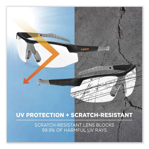 The Skullerz® Skoll Safety Glasses are named after the Norse Wolf God of Sun and Moon. These protective work safety sunglasses feature tough scratch-resistant lenses filter 99.9 percent of harmful UVA, UVB and UVC rays to keep your eyes safe in the sun. The blade-style design is a sleek and sporty look with all the features you've come to expect from Skullerz® Eye Protection at an outstanding value. The durable frames bend and flex without breaking. Flexible rubber temples and non-slip nose piece offer a non-slip, comfortable fit. These impact-resistant safety glasses also offer high velocity protection.