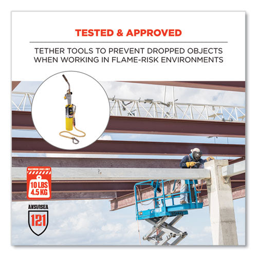 The Squids 3120 Burn + Cut-Resistant Aramid Tool Lanyard with Dual Loop Ends is made of DuPont™ Kevlar® to reduce the potential for burning, abrasion and general degradation when exposed to sparks, flames, heat and sharp edges or objects. Loops on both ends make it easy for the user to tether tools weighing up to 10 lb on one end and to fixed anchor points on the other, minimizing the potential for accidentally dropped objects and tools from becoming dangerous projectiles when working at heights. Constructed of 100% non-conductive, heavy-gauge aramid-fiber webbing, this ultra-durable, elastic tool lanyard provides the strength and durability required in the harshest work environments, even when working around exposed electrical circuits and high-heat sources. Single-length webbing format also eliminates the potential for the weak points commonly seen on multi-component lanyard alternatives. These tool lanyards are built to withstand defined weight limits and can easily be used by any worker to help avoid accidentally dropping objects that could cause extensive property damage and serious, potentially deadly injuries. This tool tether is third-party certified to a 10 lb maximum working capacity with a 2:1 safety factor.