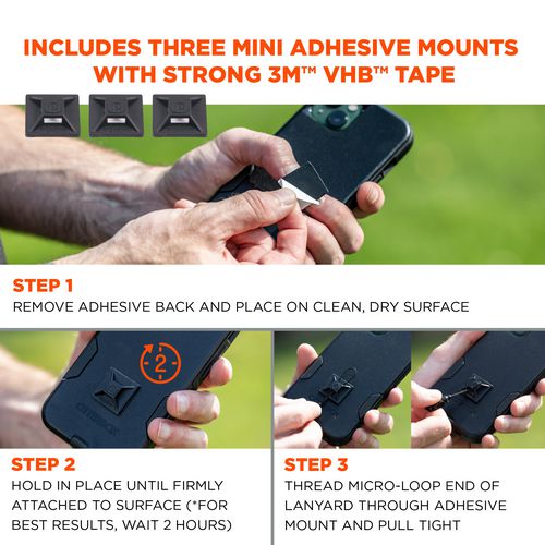 The Squids 3151 Coil Lanyard with Mini Adhesive Mounts features a swivel hook on one end, a low-profile detachable loop on the other and three double-sided mini adhesive mounts to safely tether devices and accessories up to 2 lbs. Using high-strength and double-sided 3M VHB tape, the mini adhesive mounts easily attach to items such as cell phones, cameras, hand tools and other accessories to keep them close and ready while also preventing drops. The swivel hook end rotates 360° and features a thumb action lever with spring-loaded latch for quick and snag-free attachment to belt loops, clothing, bags or wrist mounts. The micro-loop end threads through the small captive holes of the included mini adhesive mounts, with a detachable modular buckle for quick exchange. The low-profile coil design stays out of the way to reduce snag or tangle hazards. This coiled lanyard is great for all types of everyday use, including worksites or weekend activities.